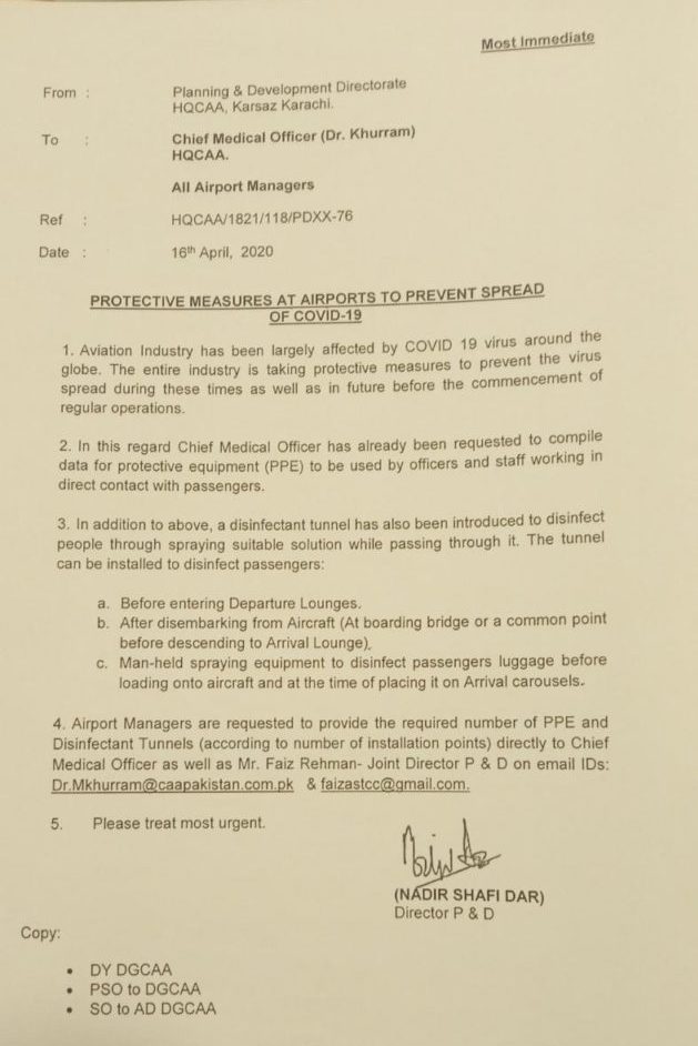 It has also been advised to the airport managers to provide the required number of PPE and disinfectant tunnels, according to the number of installation points with immediate effect.