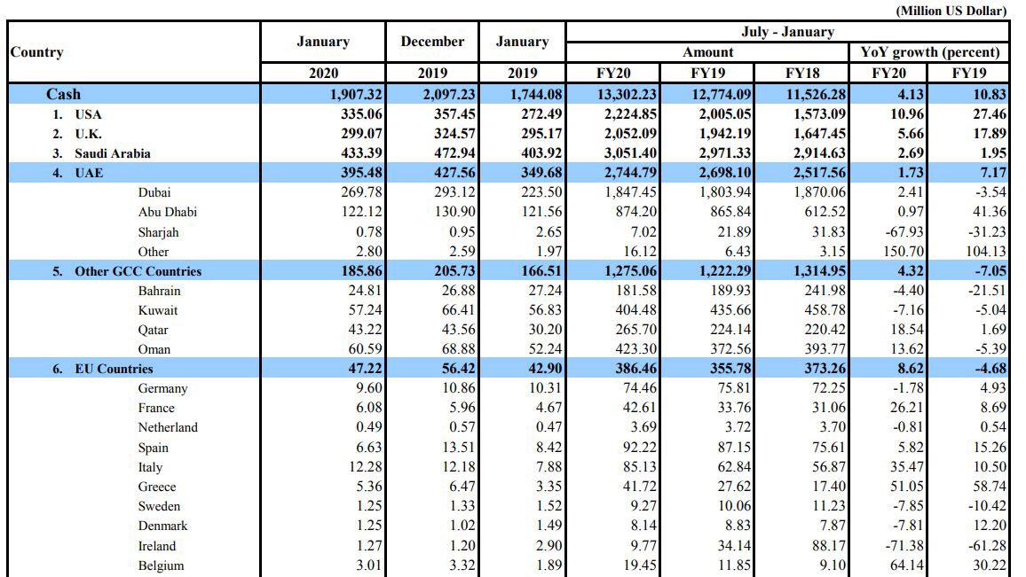 On the other hand, the growth in remittances from Saudi Arabia and the UAE, were recorded as $3.051 billion and $2.744 billion, respectively. In terms of growth, the remittances from Saudi Arabia and the UAE were 2.69 percent and 1.73 percent, respectively, in FY20 as compared to 1.95 percent and 7.17 percent in FY19.