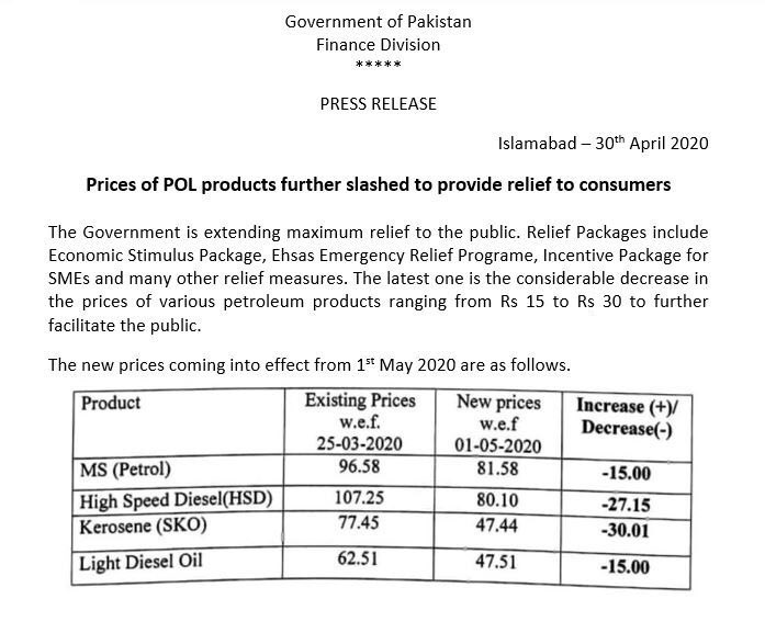 The federal government has made a major reduction in petroleum products’ prices between Rs15 to Rs30 for May.