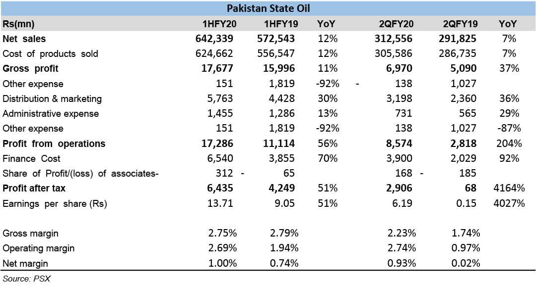 Pakistan State Oil’s (PSX: PSO) earnings have jumped by more than 50 percent in 1HFY20, while the latest quarter (2QFY20) has seen a staggering increase of over 40 times increase in earnings on a year-on-year basis.